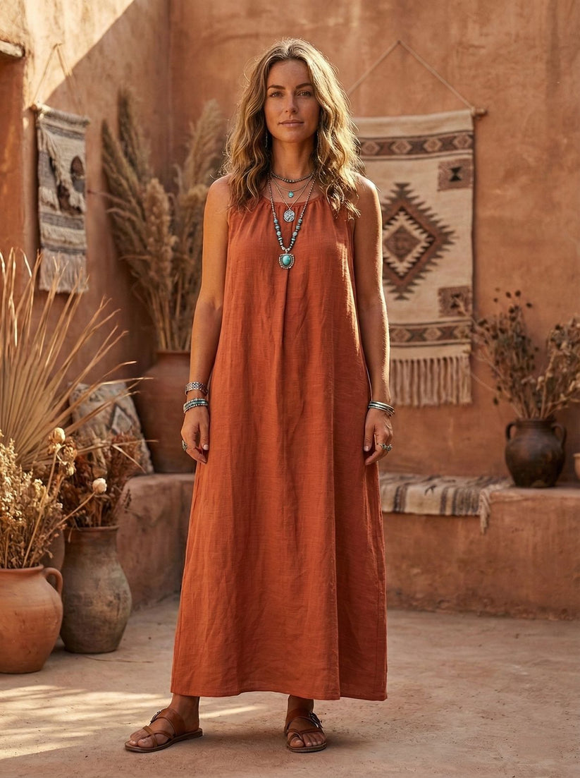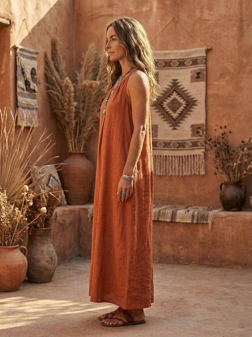 The vibrant Desert Amber ( Rust )  —draws inspiration from forest paths and sunlit meadows, making this dress a timeless staple for slow mornings, travel days, and mindful living.