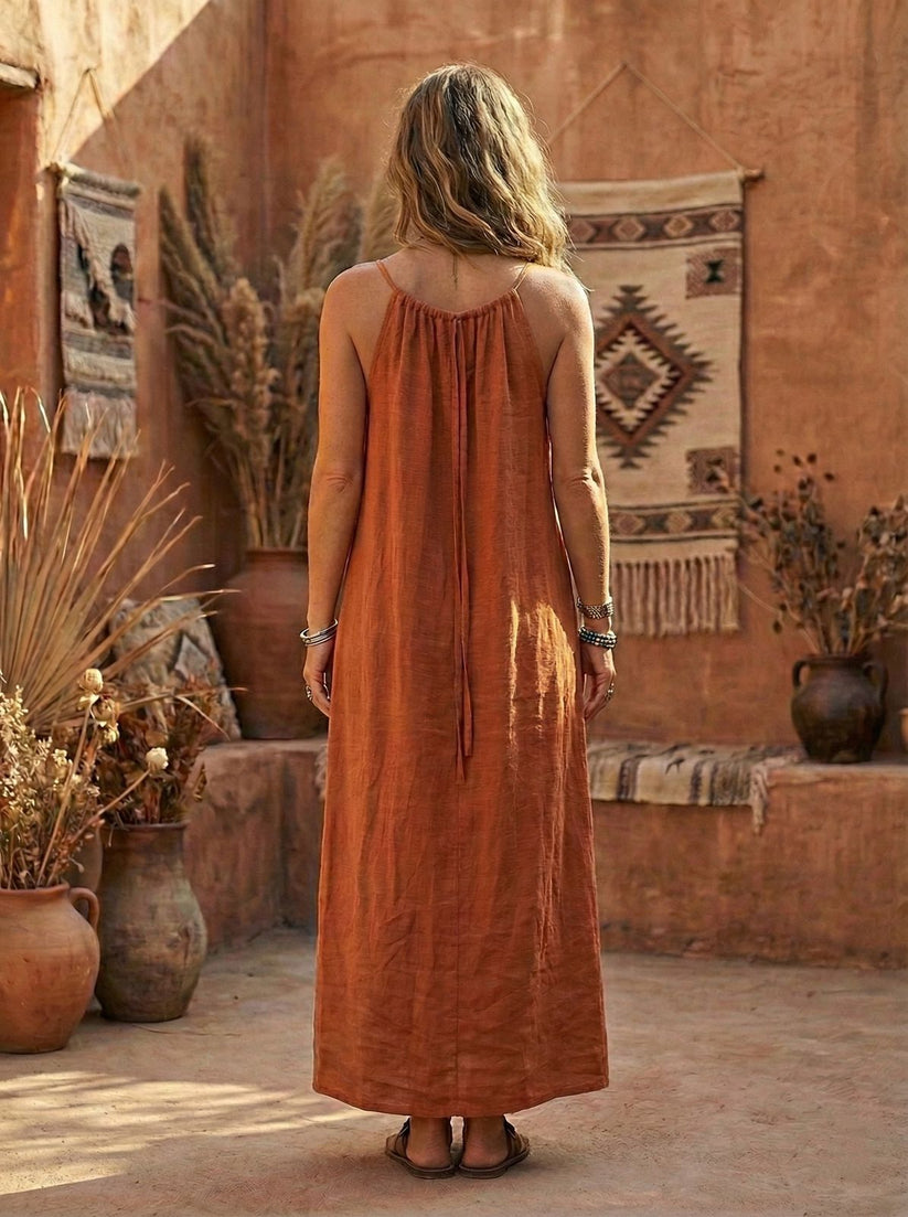 Rooted in ease and designed for everyday wanderings, the Desert Amber ( Rust )   Flow Dress is crafted in breathable Linen cotton with a naturally textured finish. Its relaxed silhouette drapes effortlessly on the body, offering comfort without compromising on elegance.