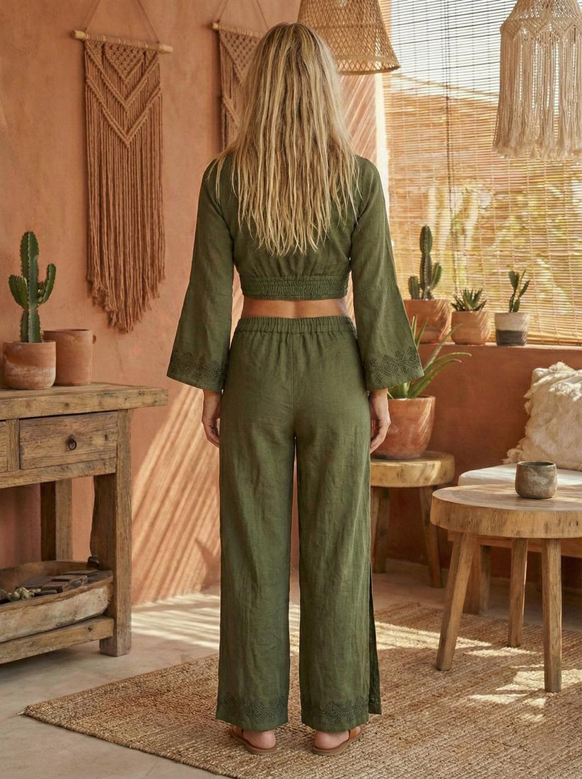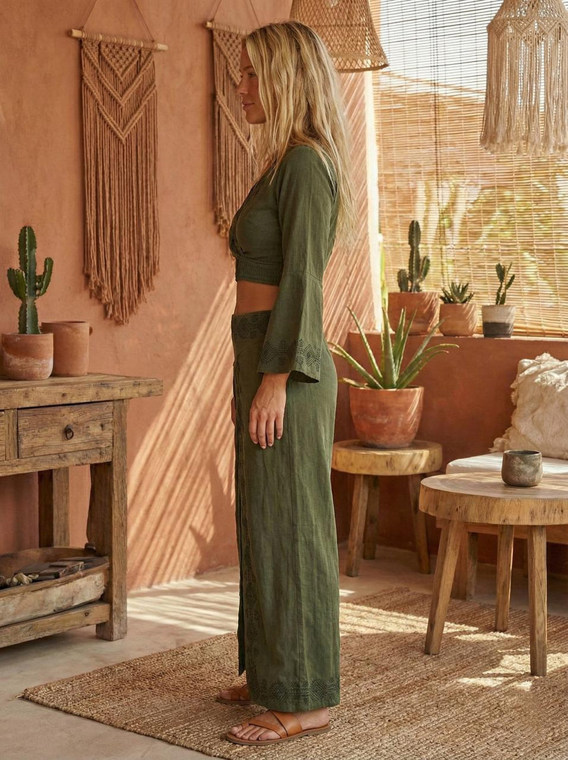 Effortlessly rooted in craft and comfort, this Forest Muse ( Olive Green )  linen cotton hand block printed co-ord set is designed for slow days and soulful styling. Featuring a wrap-style cropped top with relaxed sleeves and a skirt-cum-pant silhouette, this set blends ease with artisanal elegance.