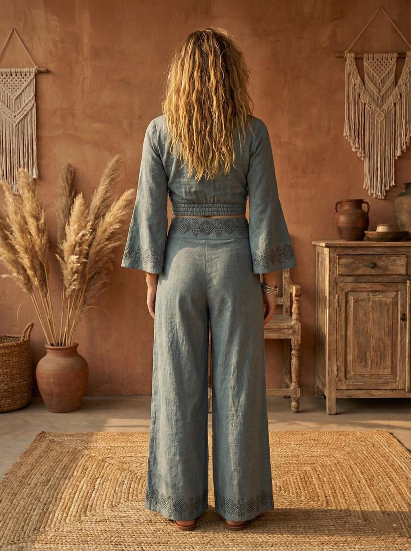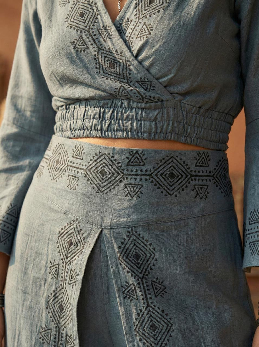 Effortlessly rooted in craft and comfort, this Indigo Haze ( Dusky Blue ) linen cotton hand block printed co-ord set is designed for slow days and soulful styling. Featuring a wrap-style cropped top with relaxed sleeves and a skirt-cum-pant silhouette, this set blends ease with artisanal elegance.