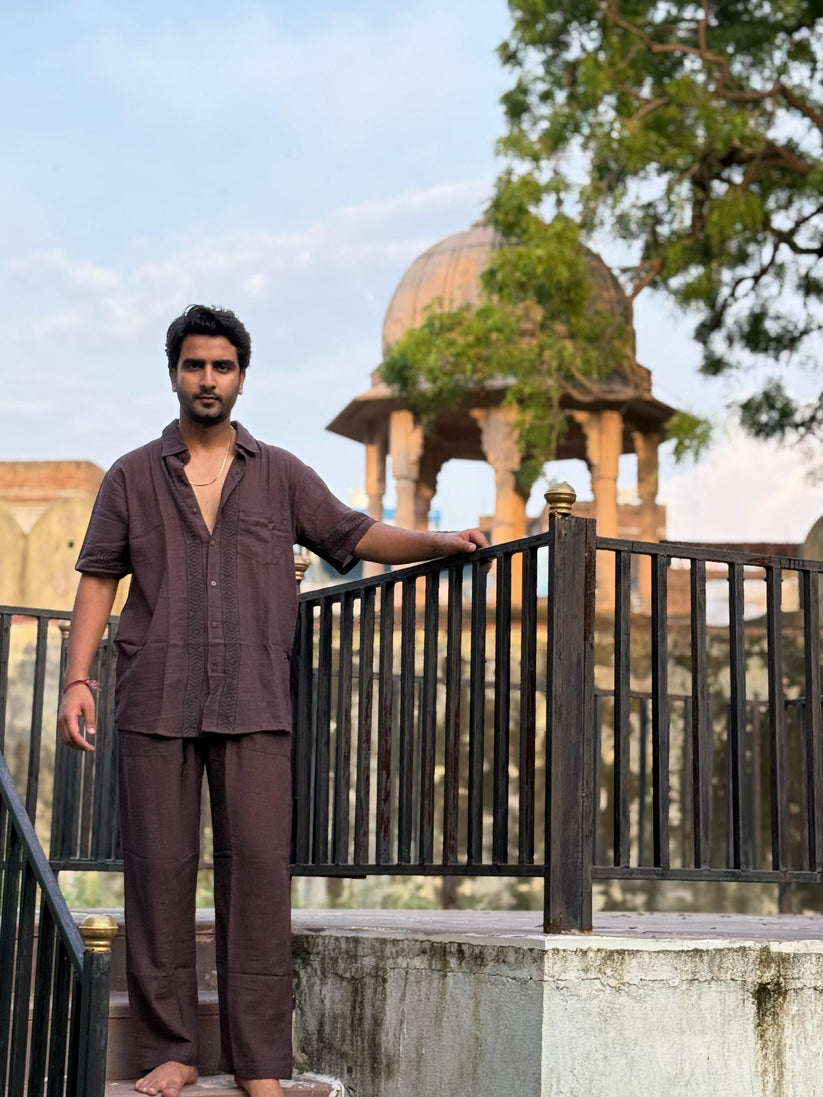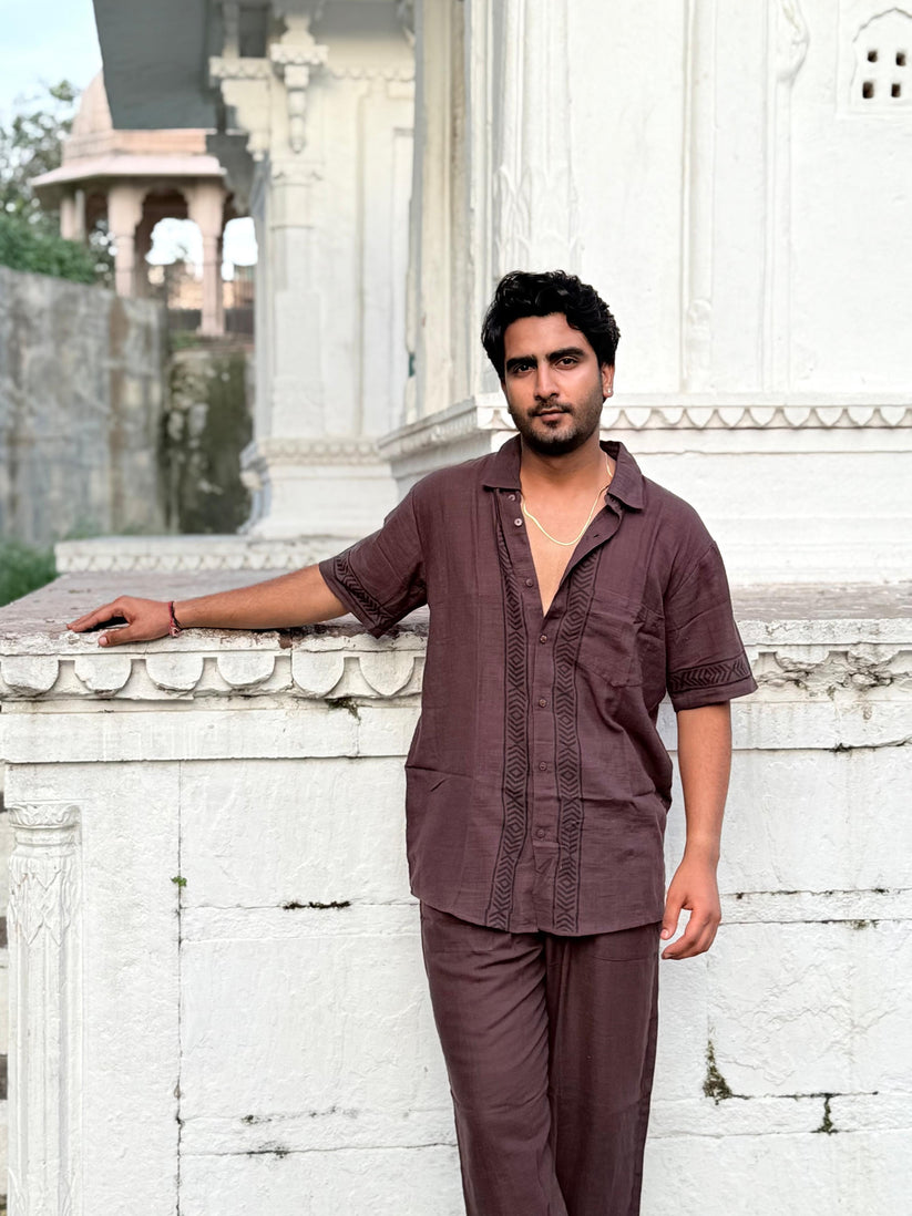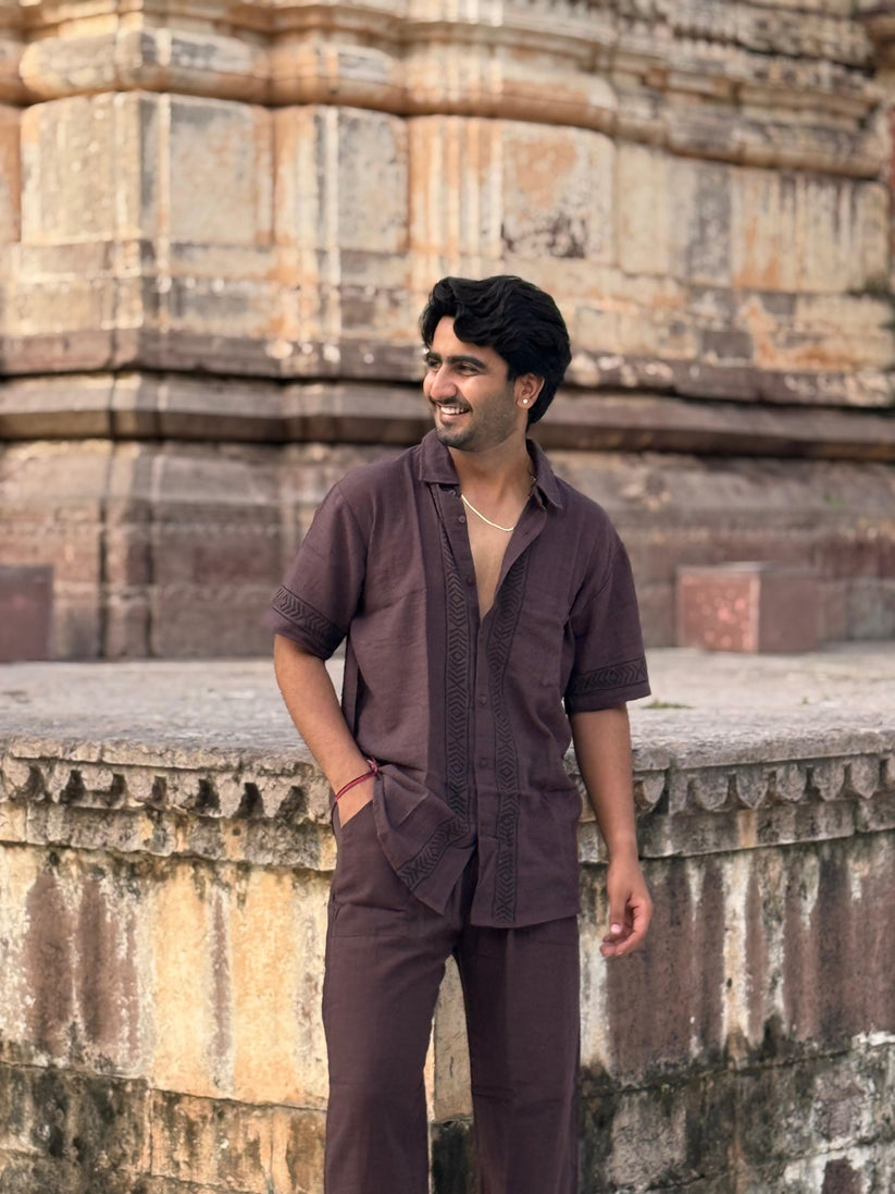 A perfect blend of comfort and craftsmanship, the Linen Cacao Shirt is handcrafted from rich, breathable  cotton and elevated with heritage-inspired hand block prints. The tribal-style detailing along the placket and sleeves adds depth and dimension to this earthy staple.