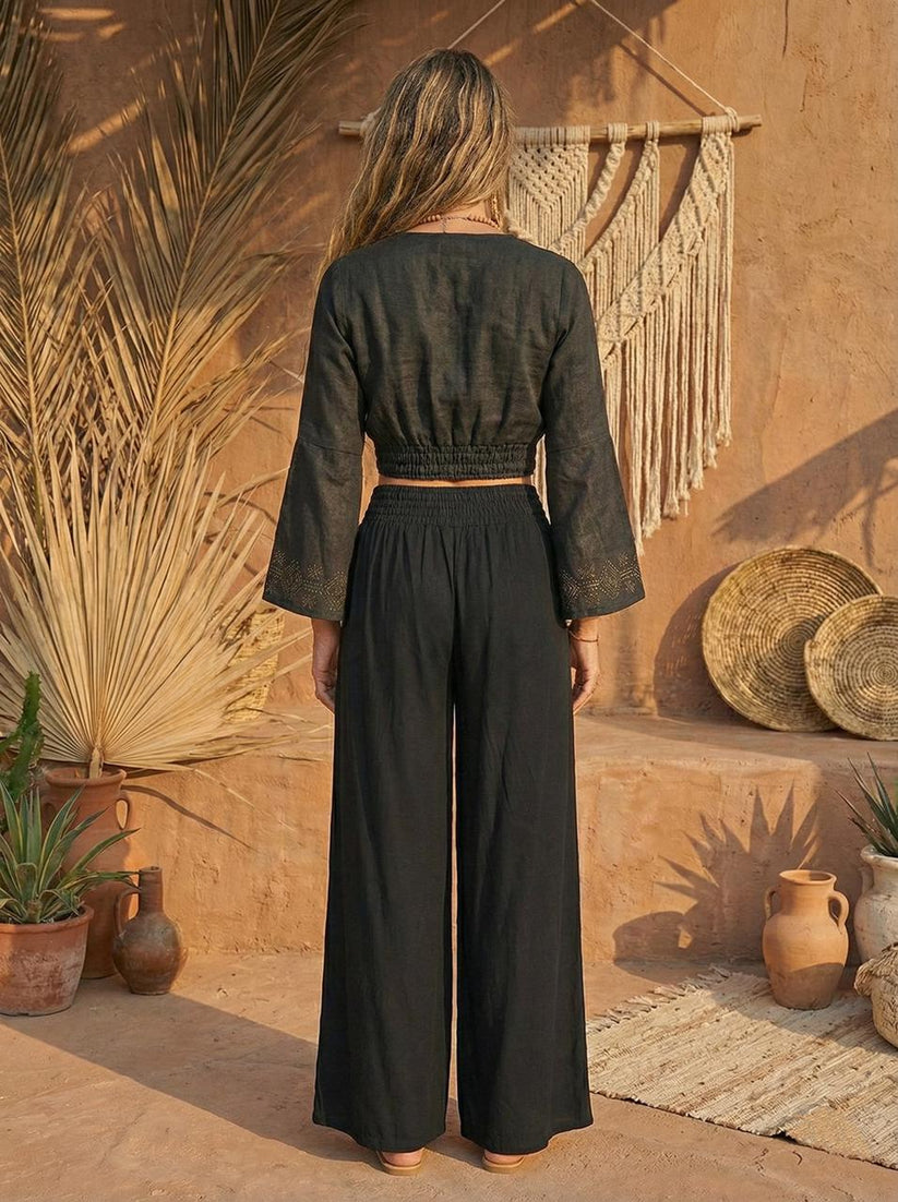 Effortlessly rooted in craft and comfort, this Noir Nomad Set ( Black ) linen cotton hand block printed co-ord set is designed for slow days and soulful styling. Featuring a wrap-style cropped top with relaxed sleeves and a skirt-cum-pant silhouette, this set blends ease with artisanal elegance.