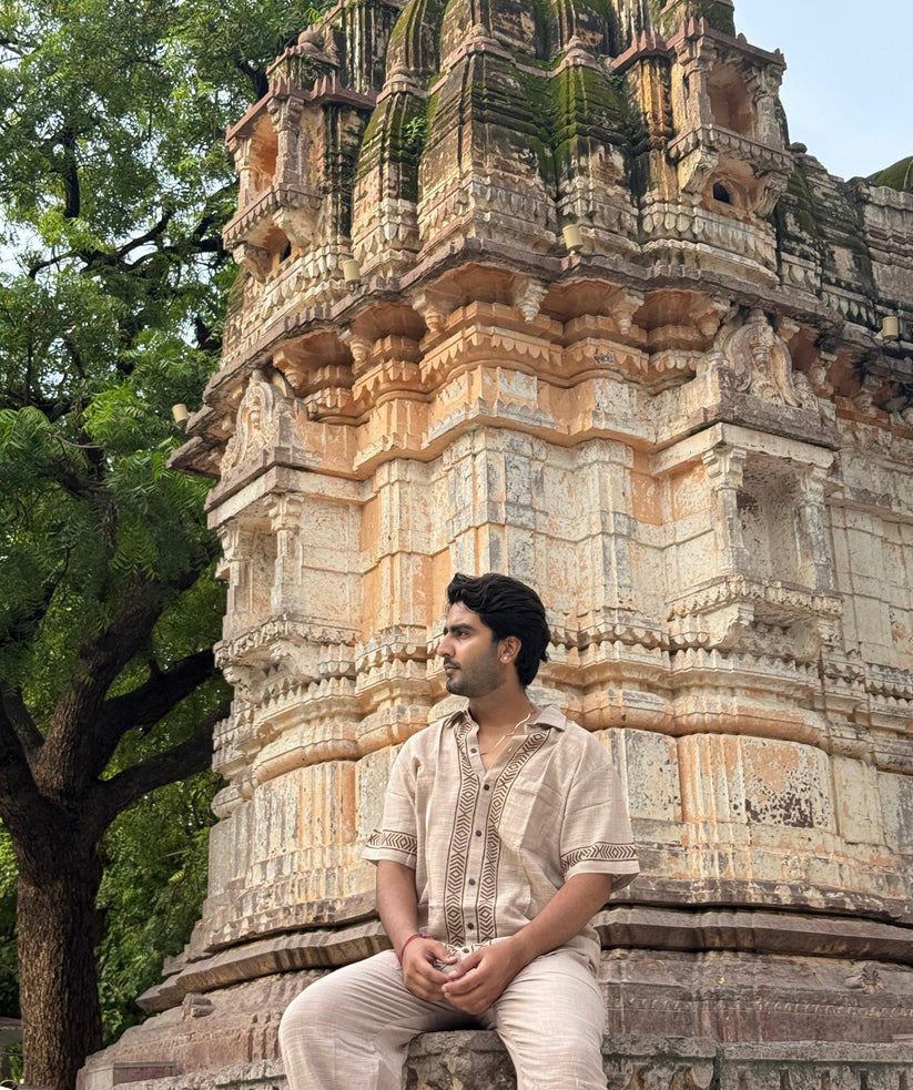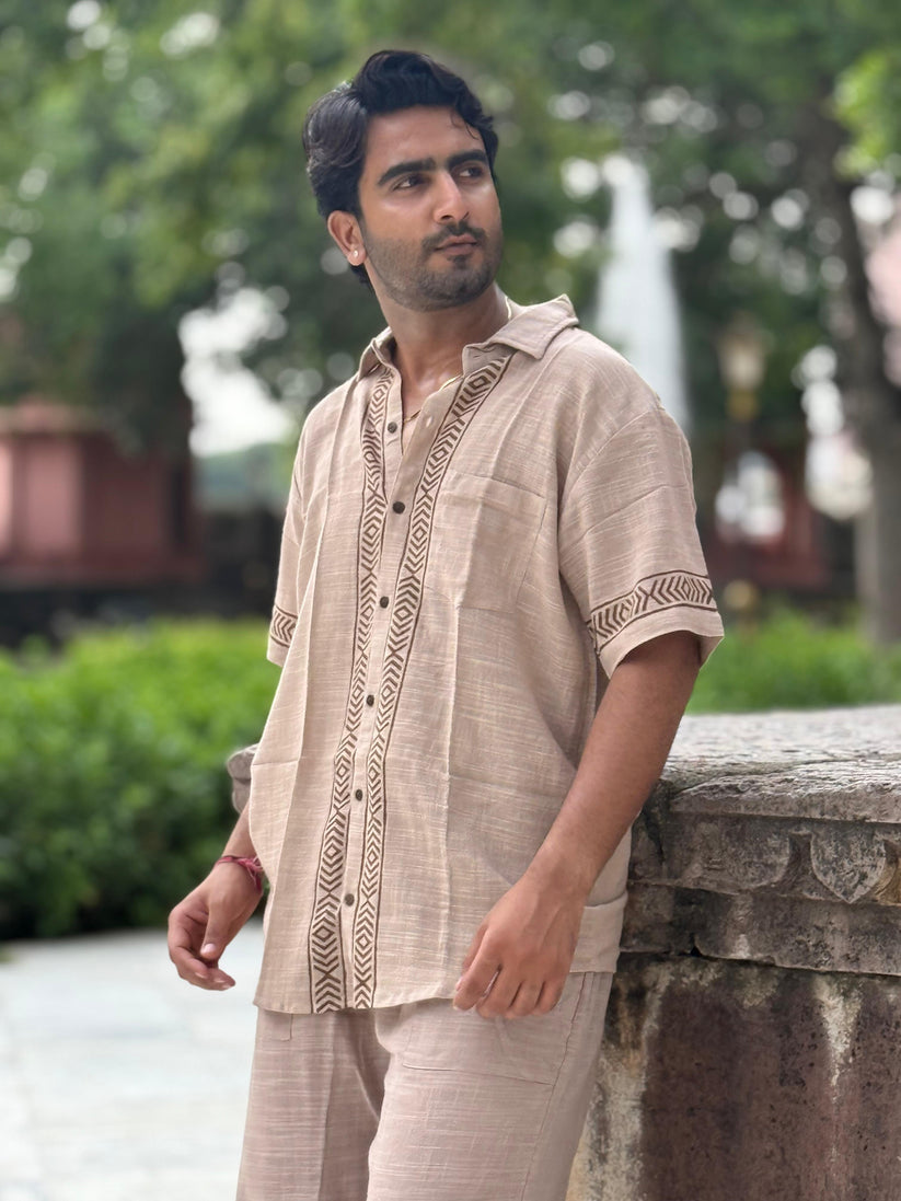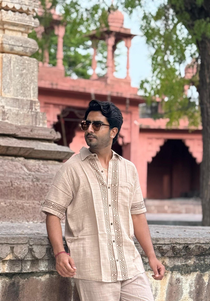 This Sandstone Beige linen shirt is a timeless piece that blends effortless comfort with artisanal detail. Made from breathable 100% pure linen, it features hand block printed accents that celebrate heritage craftsmanship in a modern silhouette.