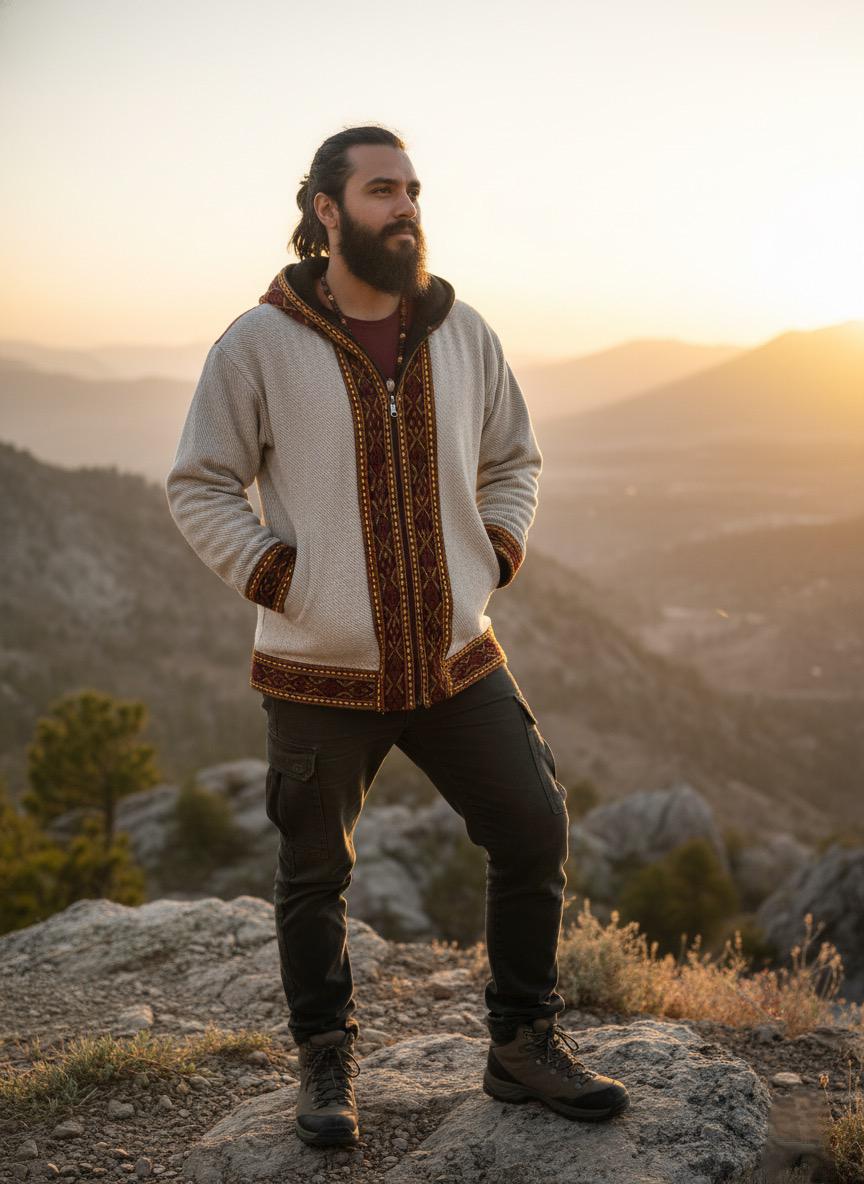 Designed to keep you cozy yet stylish, it comes with a soft inner lining, front zipper closure, and spacious side pockets. The intricate woven detailing adds a cultural, timeless vibe, making it ideal for travel, casual outings, or cool-weather layering.