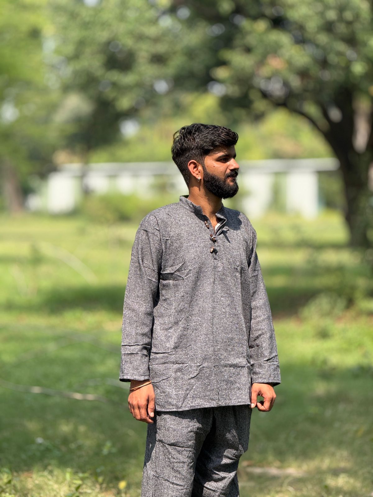 Bring timeless sophistication to your wardrobe with our Graphite Grey Khadi Cotton Kurta, crafted from 100% handspun and handwoven khadi. The deep grey tone, rich in texture and character, captures the perfect blend of rustic charm and contemporary style.